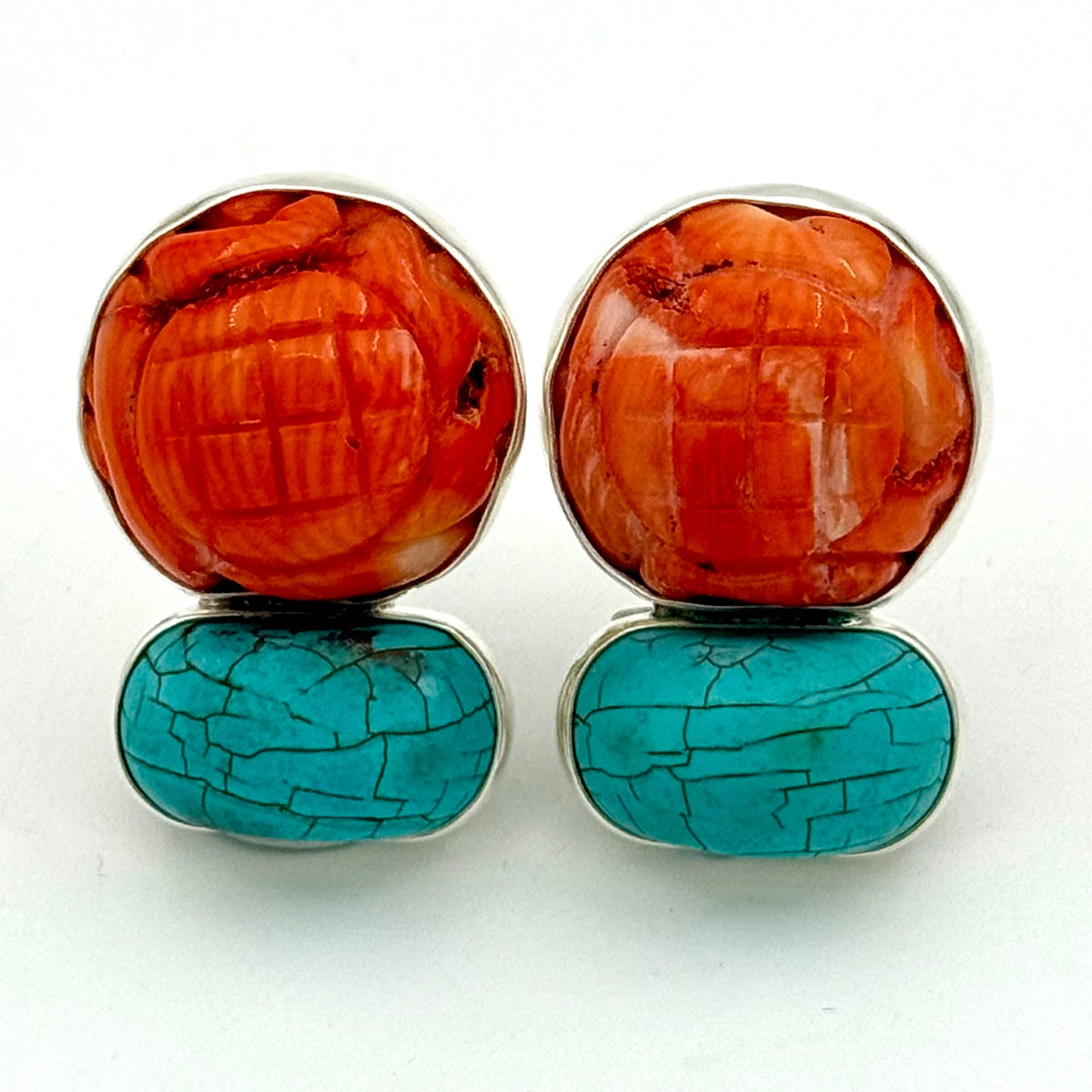 Carved Coral and Buffalo Turquoise Clip Earrings