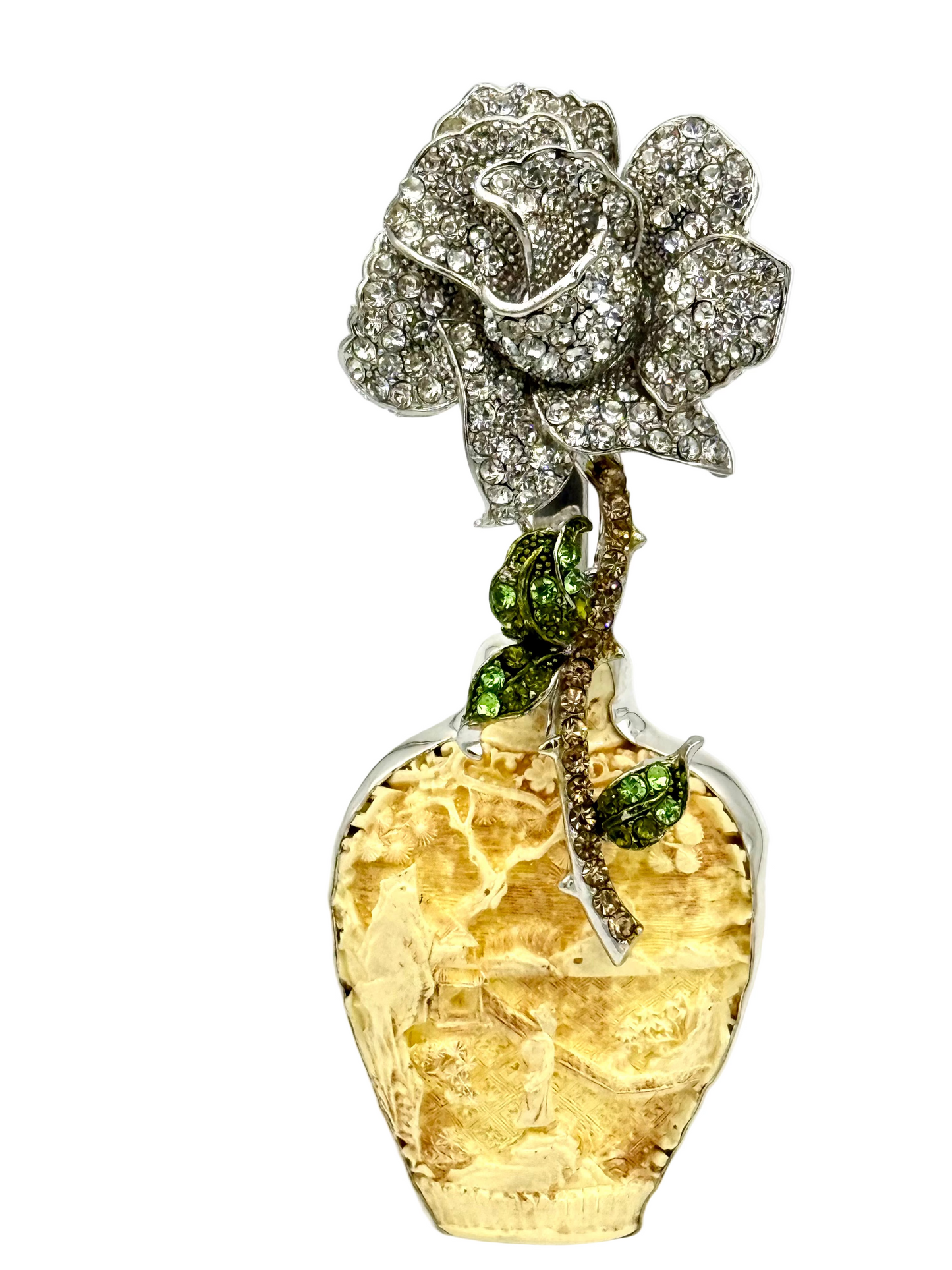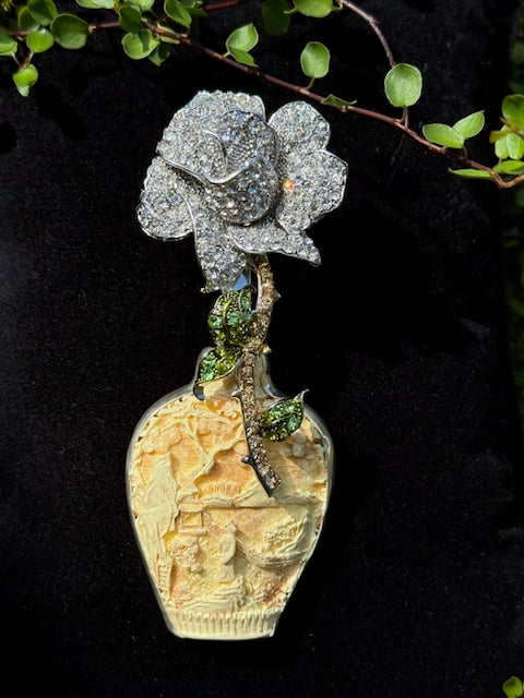 A Rhinestone Flower in a Carved Vase in Sterling Silver Brooch