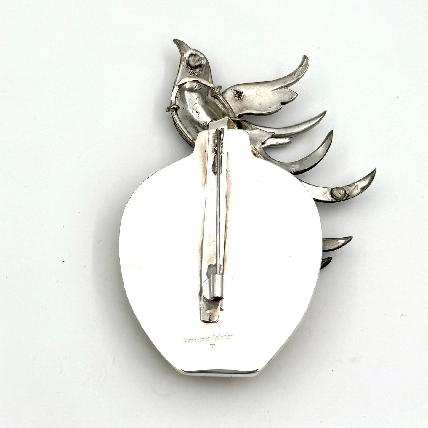 Vintage Rhinestone Bird paired with a Carved Vase in Sterling Silver to create a one of a kind Brooch